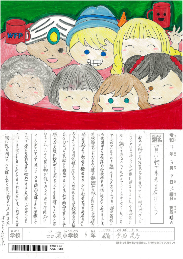 2025年11月30日、横浜市役所アトリウムにて「SDGs未来都市・環境絵日記展2025」および表彰式が行われました。横浜グリーン購入ネットワークでは「横浜グリーン購入ネットワークSDGsすいしん賞」として、品濃小学校6年今西果乃さんの作品「買い物で未来を広げよう」を選定し、表彰させていただきました。