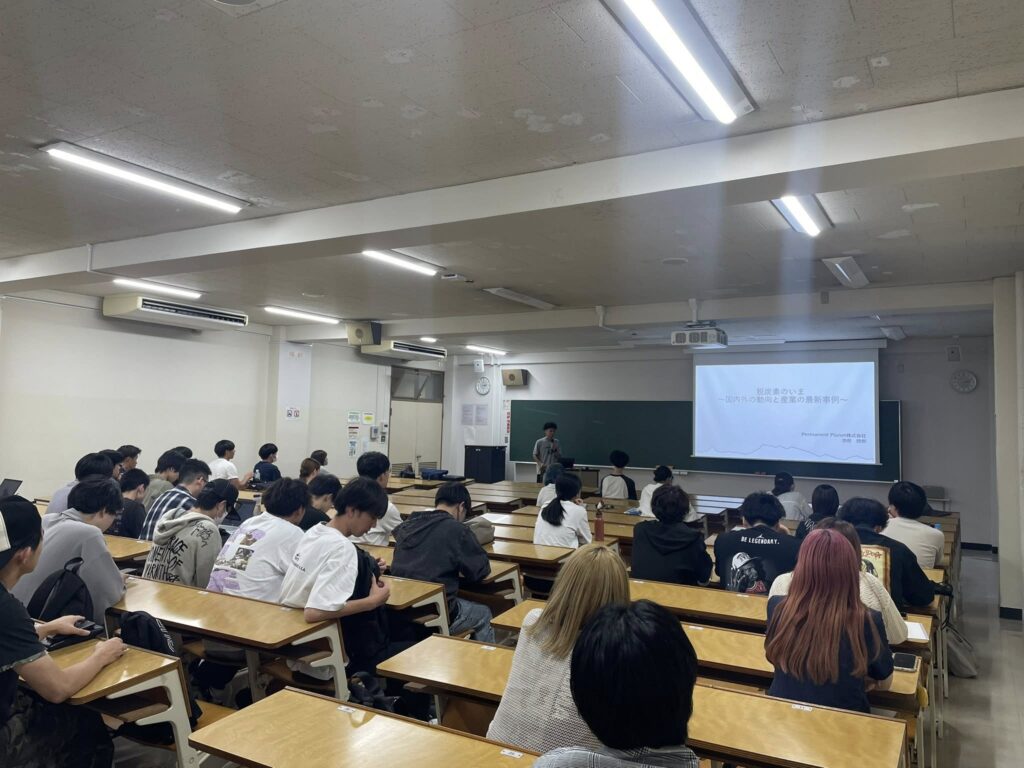 10月7日はPermanent Planet社より気候変動と、それを取り巻く世界情勢、日本における政府の対応状況など90分をかけて講義を実施しました。難しい問題ですが、学生の皆さんがこれからの就活における企業選定や自らの生活に活かしていただければと思います。